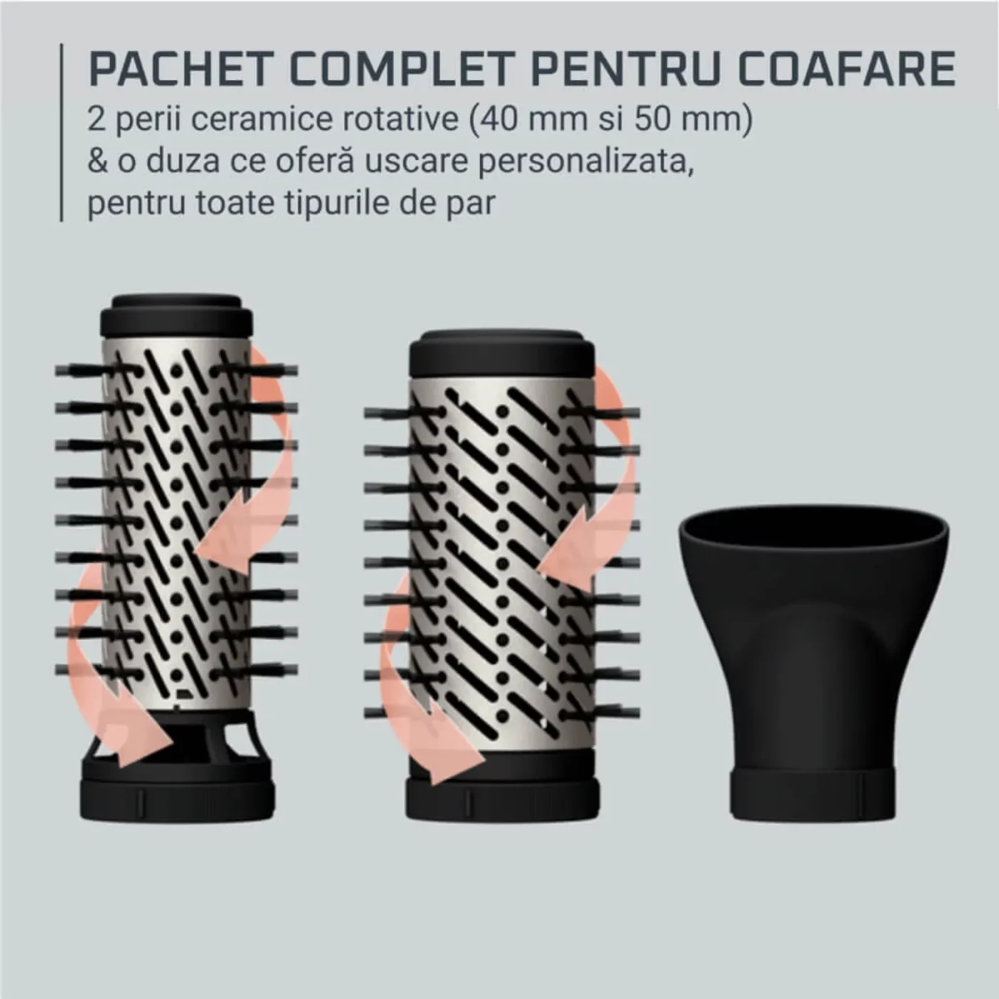 Ευέλικτο styling με 2 περιστρεφόμενες βούρτσες (40/50 mm) και συμπυκνωτή.