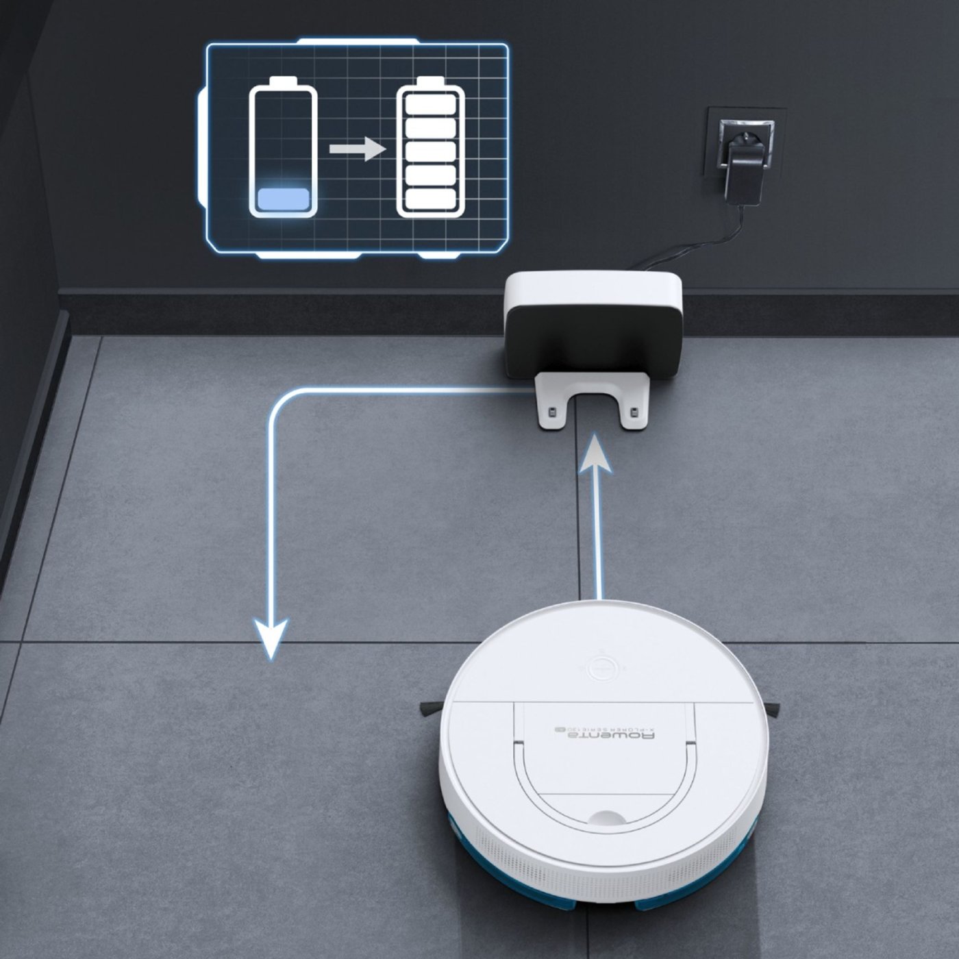 Η μπαταρία ιόντων λιθίου προσφέρει έως και 120 λεπτά λειτουργίας και καλύπτει έως και 120 τ.μ. σε μία μόνο συνεδρία. Όταν η στάθμη της μπαταρίας μειωθεί, η λειτουργία Charge & Go στέλνει την ηλεκτρική σκούπα στον σταθμό φόρτισης και συνεχίζει τον καθαρισμό μετά τη φόρτιση.