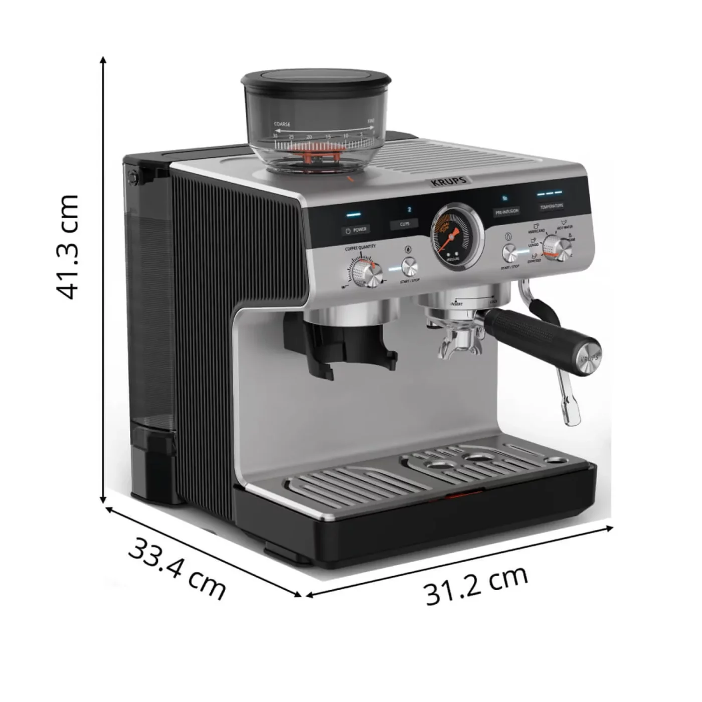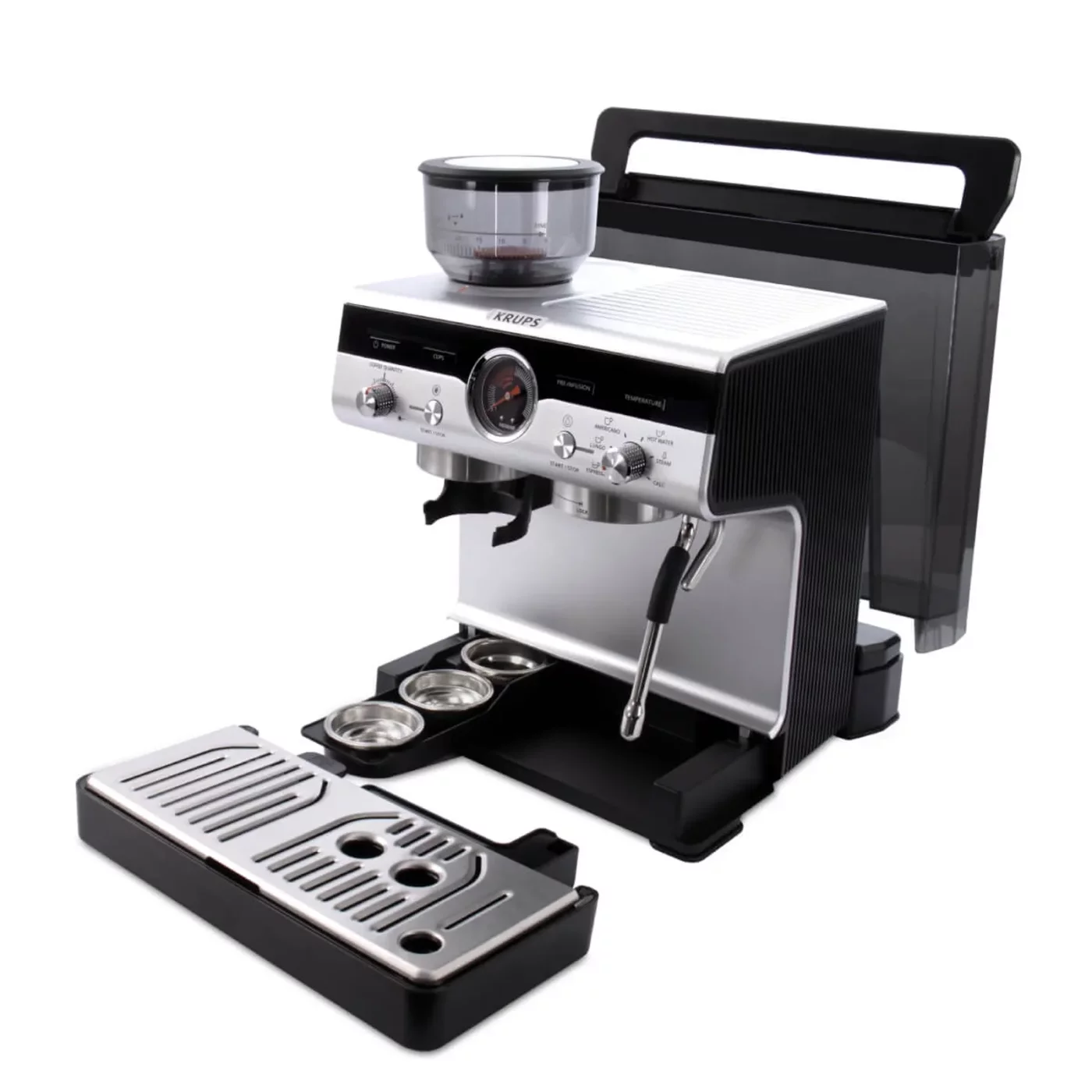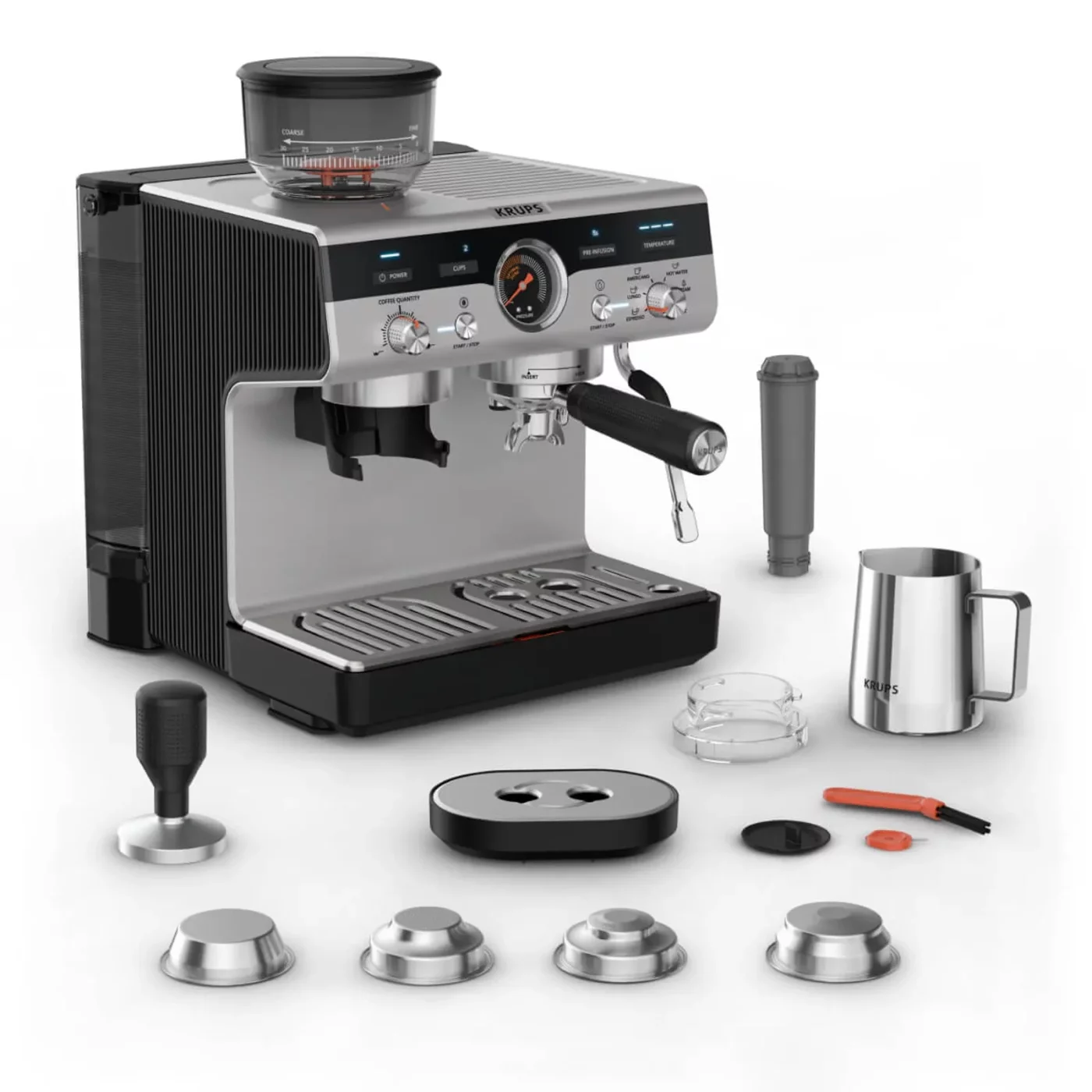 Χειροκίνητη μηχανή εσπρέσο με μύλο άλεσης Krups Precision XP801T10, 15 bar, δεξαμενή νερού 3,5 L, 30 ρυθμίσεις άλεσης, 3 θερμοκρασίες