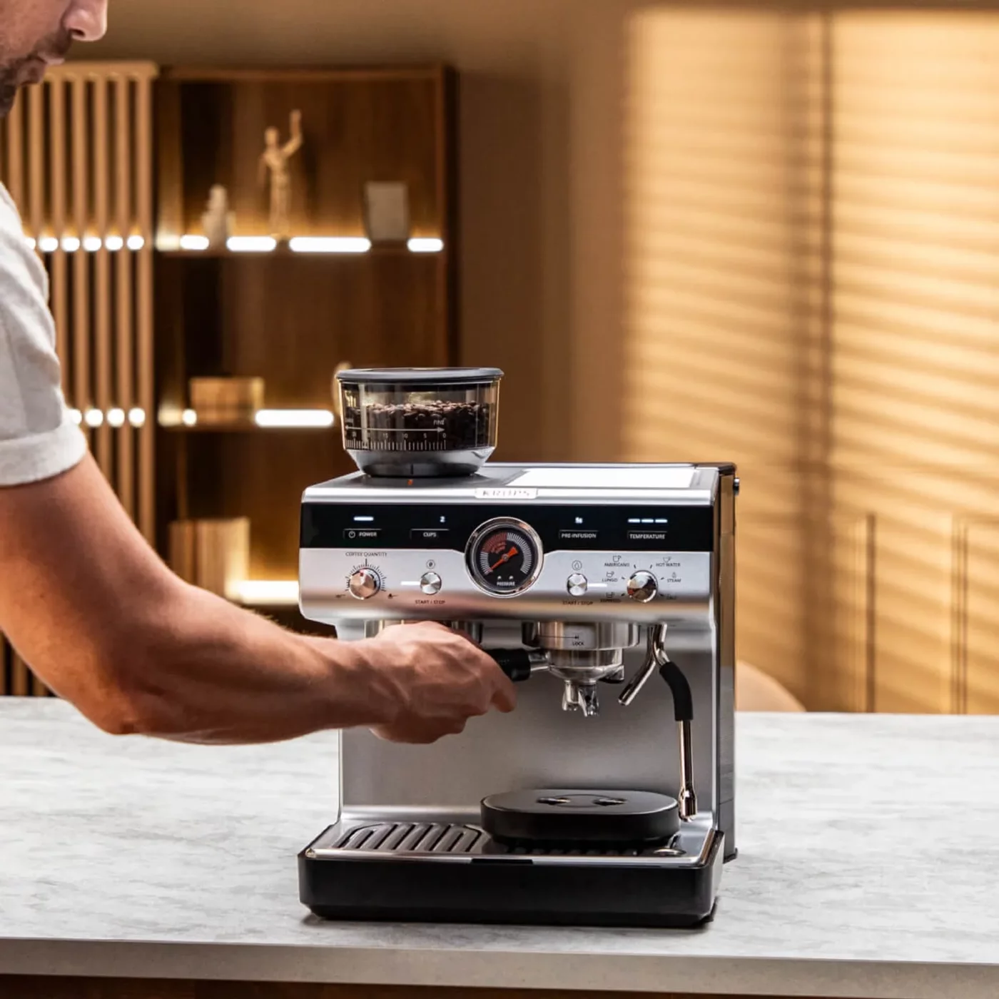 Ο έξυπνος πίνακας ελέγχου προσφέρει γρήγορη πρόσβαση σε όλες τις βασικές λειτουργίες, επιτρέποντάς σας να προσαρμόσετε κάθε βήμα της διαδικασίας παρασκευής. Έχετε την ελευθερία να φτιάξετε τον εσπρέσο σας ακριβώς όπως σας αρέσει.