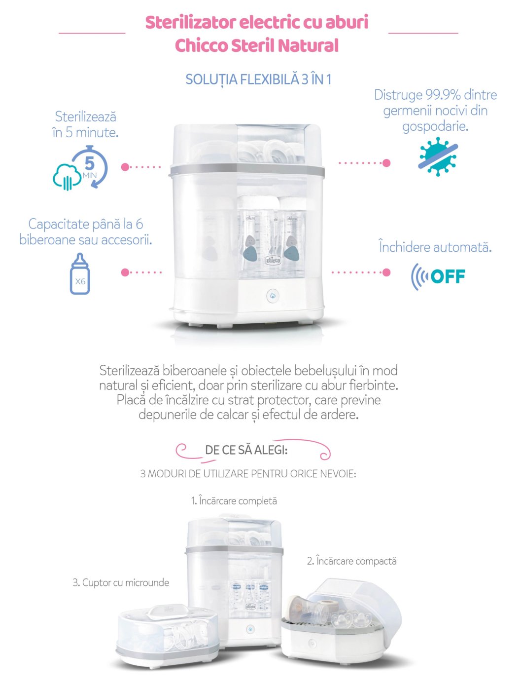 Ο ηλεκτρικός αποστειρωτής της Chicco αποτελεί την ιδανική λύση για τον βαθύ καθαρισμό μπιμπερό, θηλών, πιπίλων και αξεσουάρ θηλασμού, προσφέροντας γρήγορη, ασφαλή και αποτελεσματική αποστείρωση.