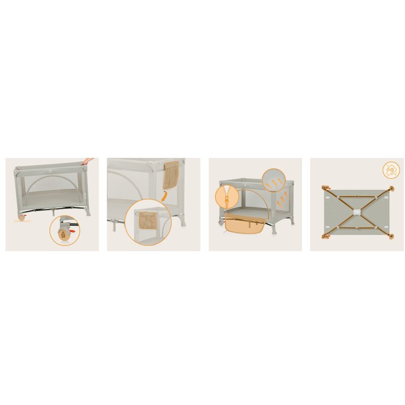 Χάρη στους δύο τροχούς με φρένο, μπορείτε να μετακινείτε εύκολα το κρεβάτι από το ένα δωμάτιο στο άλλο, ώστε το μωρό να είναι πάντα κοντά σας. Το έξυπνο σύστημα αναδίπλωσης και συναρμολόγησης το καθιστά ιδανικό για τα πρώτα σας οικογενειακά ταξίδια.